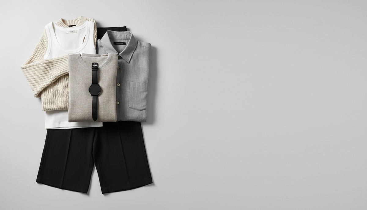 - روشن و سبک: پایهٔ سفید + طوسی روشن؛ تاکید مشکی مات در ابعاد کوچک (کمربند باریک/بند ساعت).
